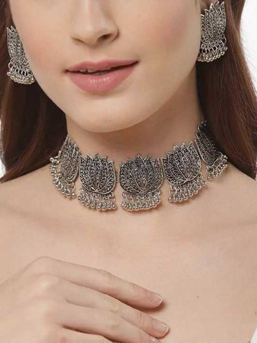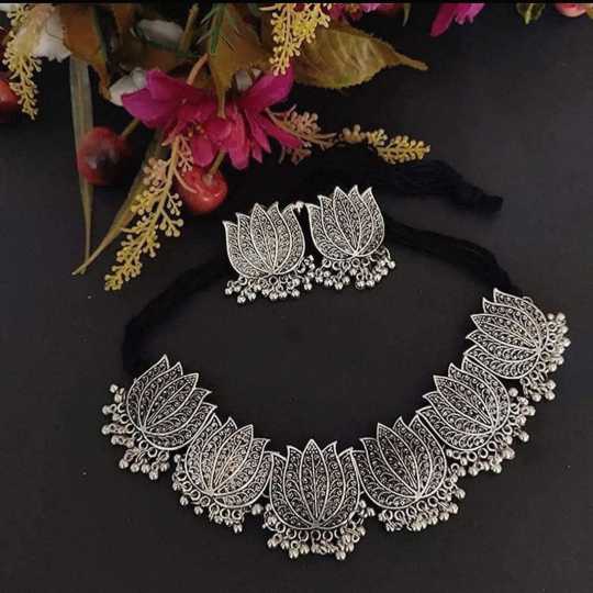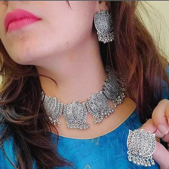 Oxidized Statement Lotus Choker Necklace Set with Earrings Jhumka Jhumki. You can wear these Chokar Necklace and Earrings on any occasion with any of your favorite outfit. These are also for gift for girls, girlfriend, wife, wedding gifts and anniversary gifts. We understand that your jewels are more than just accessories; they are an extension of your personality.